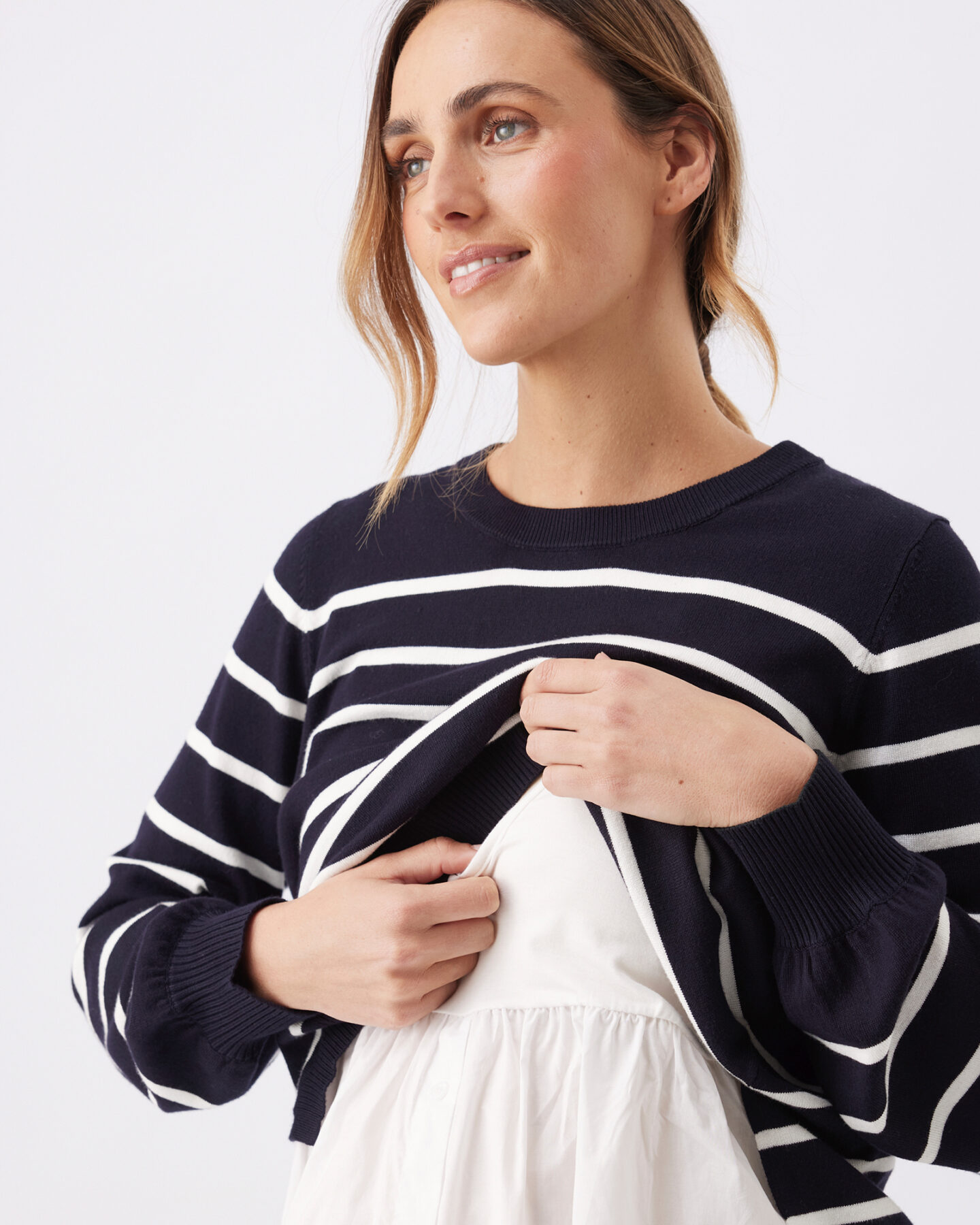 Two pieces, endless possibilities. The Anna Detachable Nursing & Maternity Knit features a relaxed-fit knit overlay paired with a detachable underlayer designed for easy nursing. Wear them together or separately for versatile styling through pregnancy and postpartum.