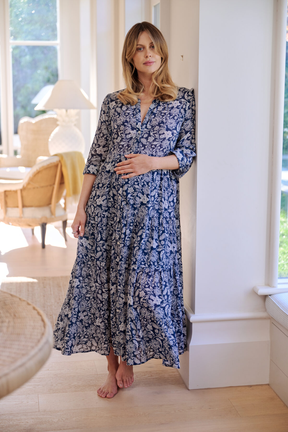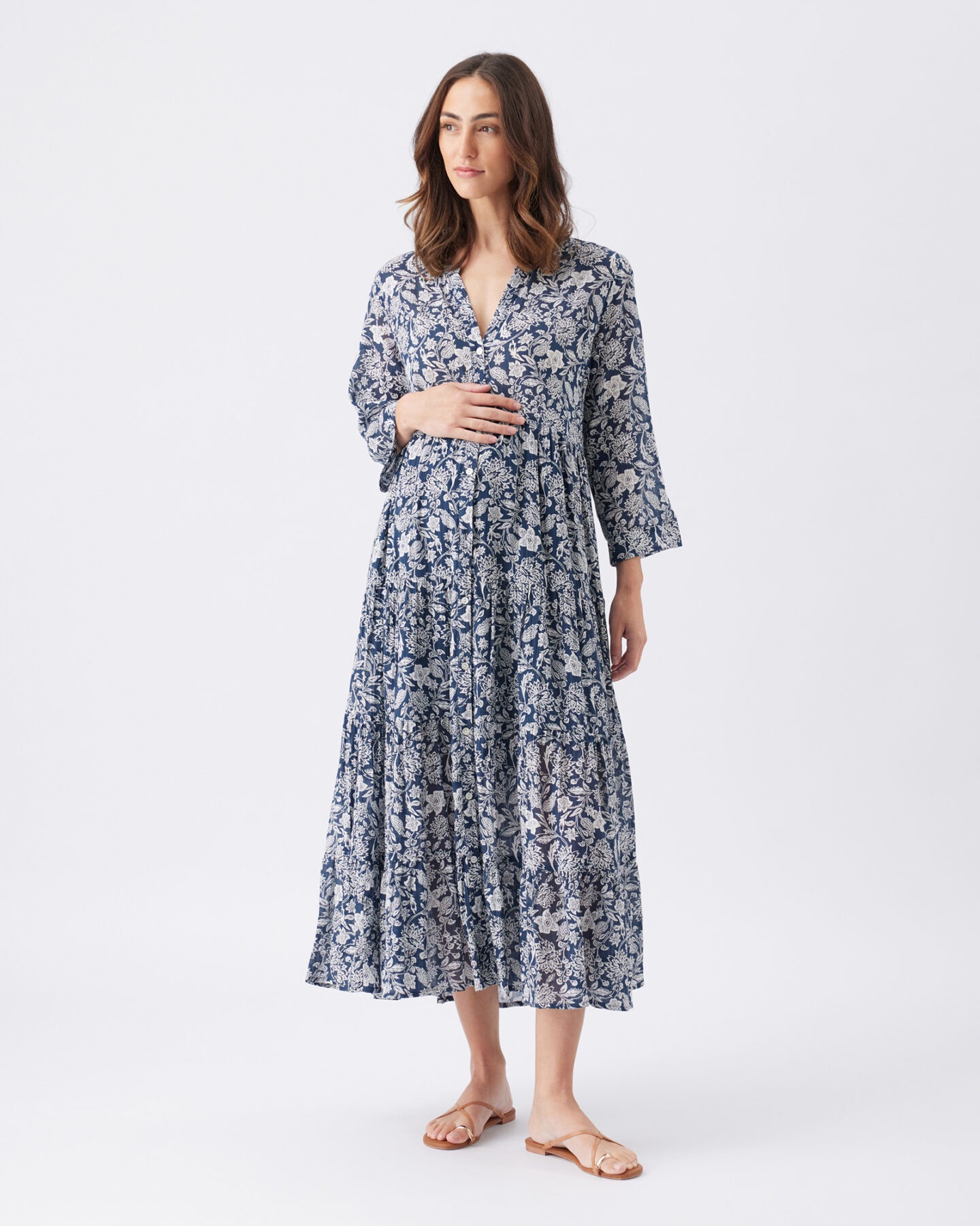 Introducing the captivating Ezra Tiered Dress, a blend of simplicity and elegance that elevates your wardrobe. Crafted from soft, breathable cotton, its relaxed fit ensures all-day comfort. The V-neckline and nursing friendly button-up front bring both style and practicality, while the elegant 3/4 length sleeves add versatility. Whether paired with sandals for a nice lunch or dressed up for an event, the Ezra Tiered Dress embodies maternity style at its finest.