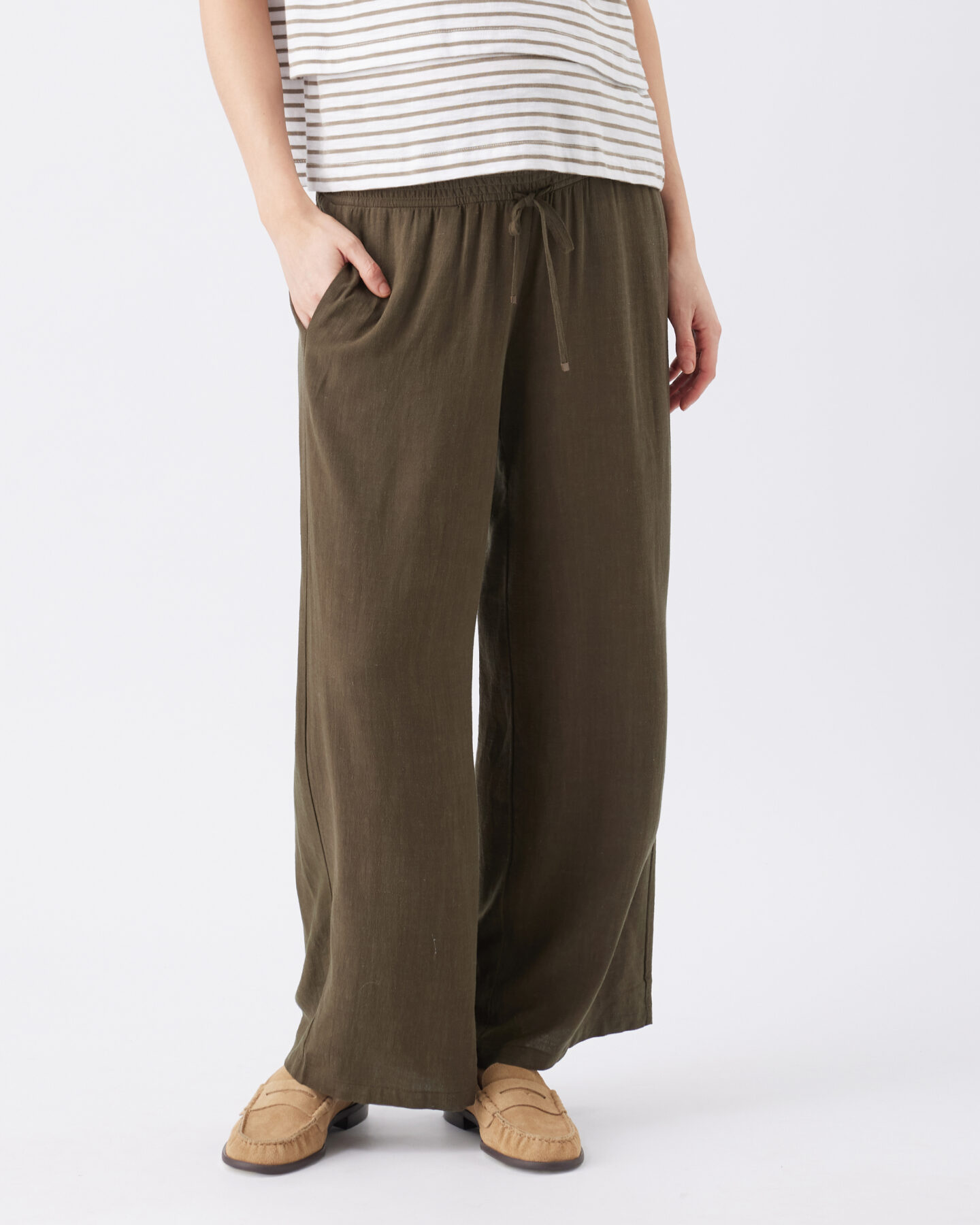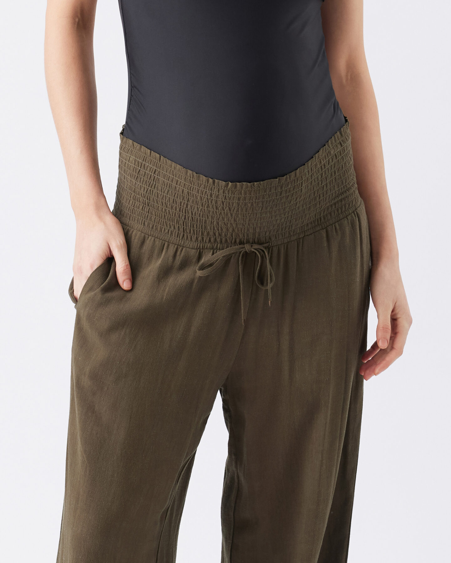 These pants are a must-have for warm-weather wardrobes. Crafted from a soft linen blend, the pants feature an easy to pull-on and comfortable shirred waistband that ensures they will be on high rotation throughout pregnancy and as you recover postpartum. Complete with side pockets, and adjustable draw string.